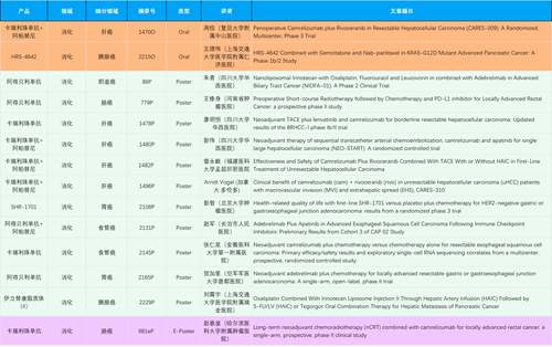 在消化系统肿瘤领域,尊龙凯时国际产品相关研究共入选2项口头报告、11项壁报和1项电子壁报,共14项研究。除卡瑞利珠单抗和阿帕替尼外,还有4篇阿得贝利单抗治疗消化系统肿瘤研究入选。HRS-4642、瑞拉芙普-α注射液(SHR-1701)等在研创新产品也有相应研究亮相。另有1项伊立替康脂质体(II)用于胰腺癌治疗的研究入选壁报。