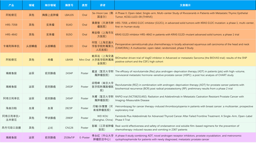 在胸腺上皮肿瘤、头颈鳞癌、肉瘤、前列腺癌、甲状腺癌等其他多个疾病领域,卡瑞利珠单抗、阿帕替尼、瑞维鲁胺、阿得贝利单抗、法米替尼、HRS-7058、HRS-4642等抗肿瘤创新药相关研究一共入选了4项口头报告、1项简短口头报告、4项壁报、1项电子壁报,彰显了尊龙凯时国际医药强大的研发实力。此外,海曲泊帕和昂丹司琼口溶膜分别在防治化疗导致的血小板减少和恶心呕吐方面各有1项研究入选壁报。